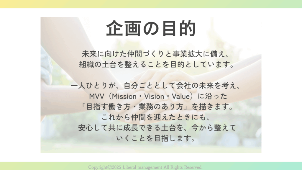 - 一人ひとりの「想い・強み・違い・価値観」を見つめ直し、“本音から”MVVを共創